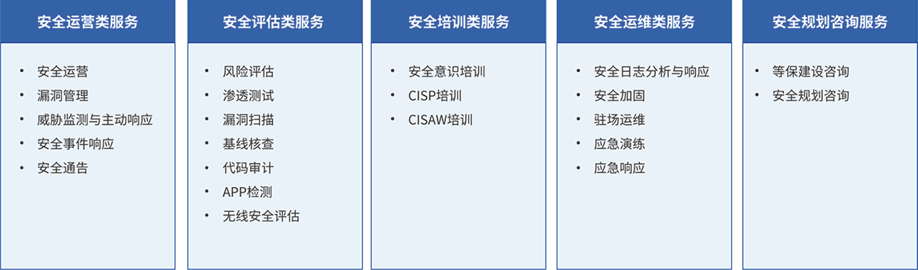 海龍科技安全服務目錄主要分為安全運營、安全評估、安全培訓、安全運維、安全規劃咨詢5大類,為安全建設不同階段的組織提供從評估到規劃,再到持續安全運營的服務,以靈活匹配組織的安全服務需求。